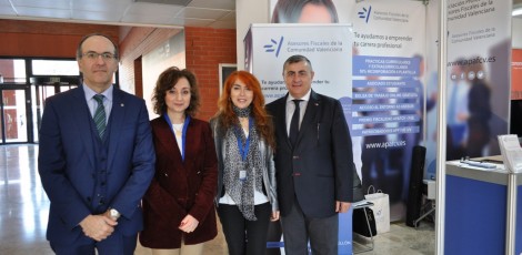 Tambien impartimos una charla a los estudiantes para explicarles en qué consiste la profesión de Asesor Fiscal, y como desde la APAFCV podemos ayudarles a iniciar su carrera profesional. Nuestros compañeros Miguel Salvador y Marisa Baguetto, acompañados por Concha Salvador, profesora del Departamento de Economía Aplicada de la UV, y dos estudiantes que ya ejercen su trabajo en prácticas, son los protagonistas de esta charla.